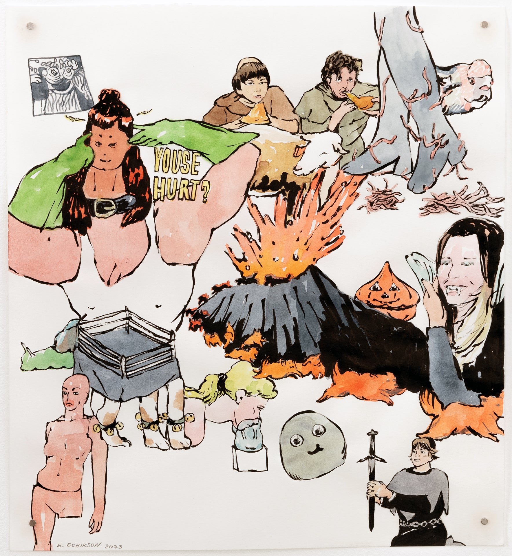 Echikson’s work weaves threads of memory, seamlessly blending past and present in a playful restoration and mending of imagery from the artist’s world. Echikson's creations serve up a rollercoaster of emotions, like a slide projector automatically advancing from image to image: humor, horror, rage, and fashion collide and are threaded together into these ever-oscillating feelings. Echikson’s works move through time and space to touch upon the gilded peaks of immortality, all while embracing the whimsy and innocence of their own inner-child.
