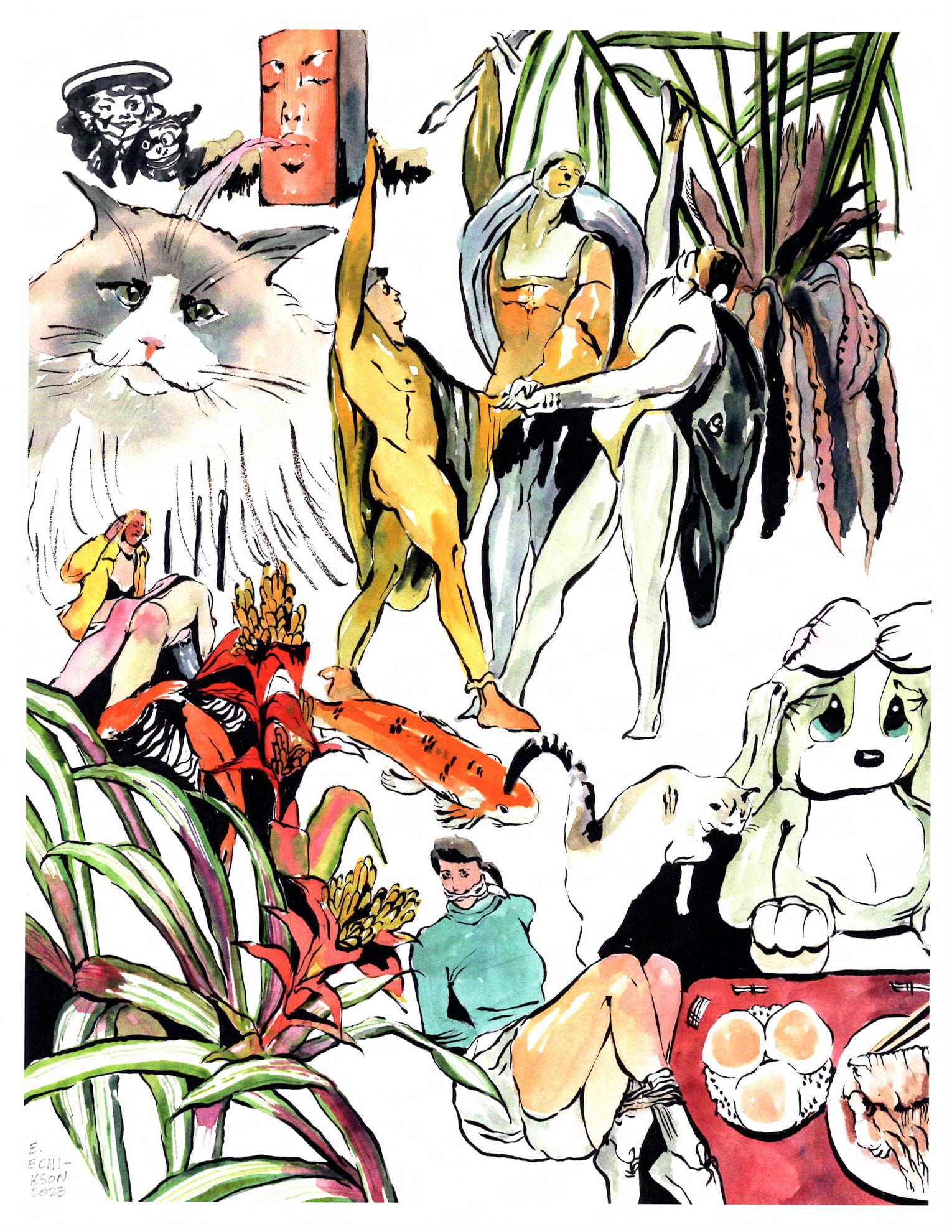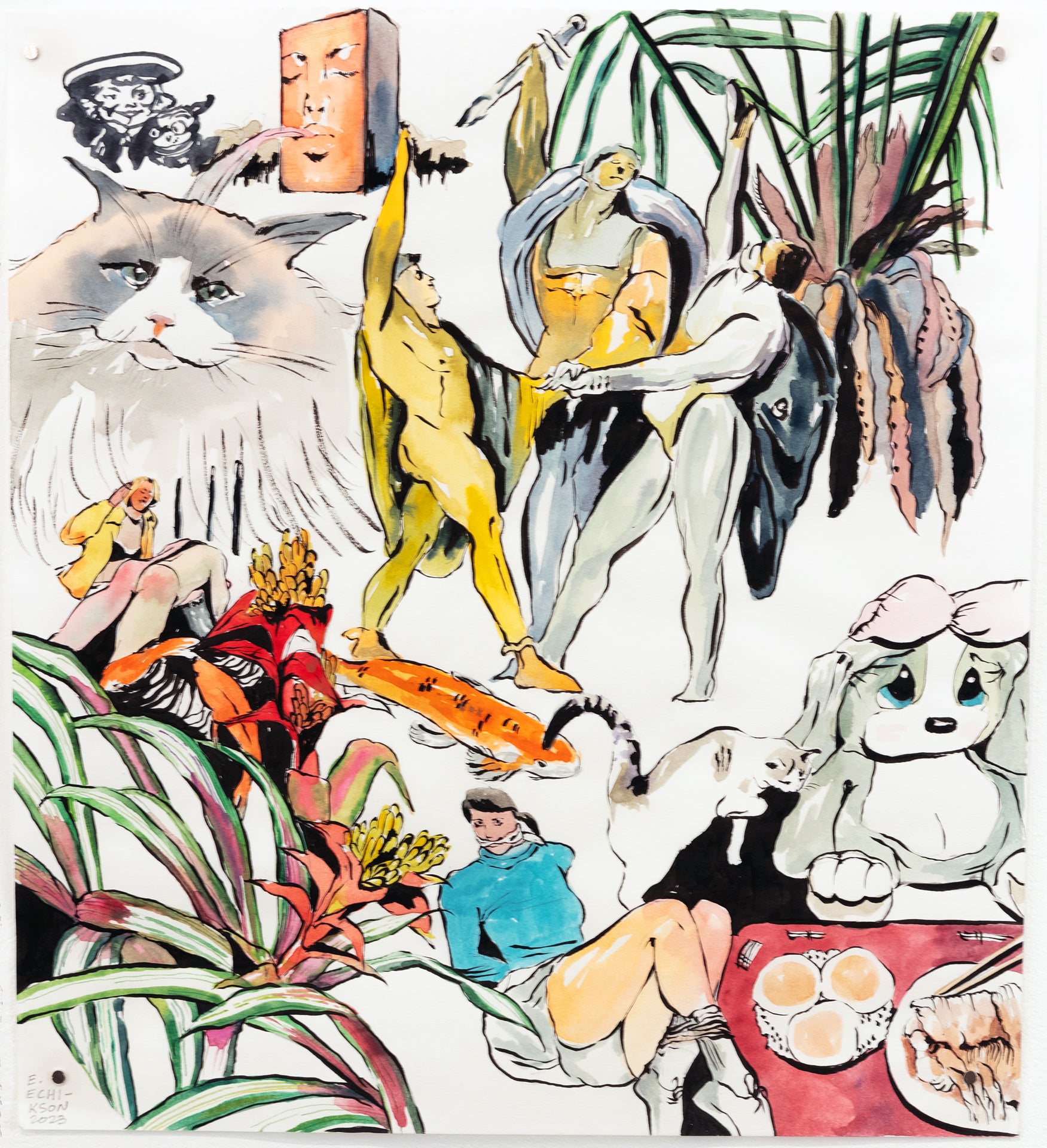 Here Sometimes offers a captivating escape, beckoning viewers into the realm of daydreamers. Echikson's illustrations serve as portals into their own waking existence, seamlessly merging reality with a meticulously crafted realm nurtured since childhood. Echikson transports the viewer to a new place with its own lifeblood fueled by comics, friendship and memory. The exhibition pays tribute to the artist's enduring appreciation of friends and individuals who have come in and out of the artist's life, embracing those little abandonments and departures that lead to new paths and transformation.