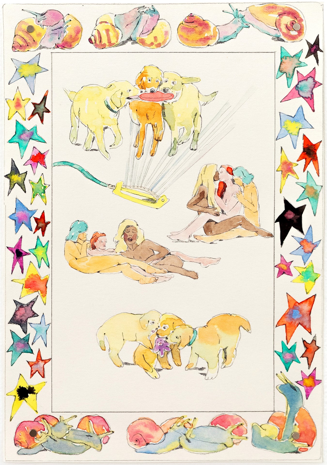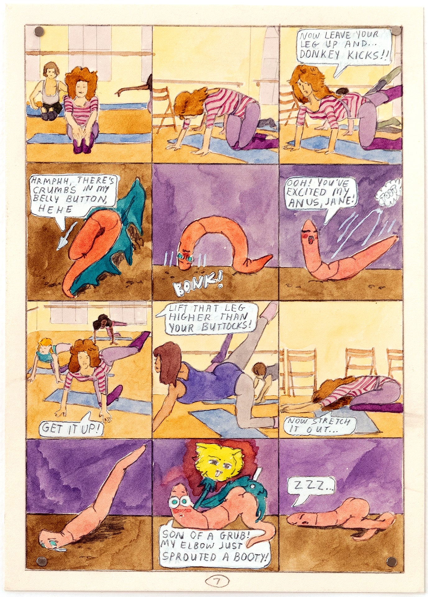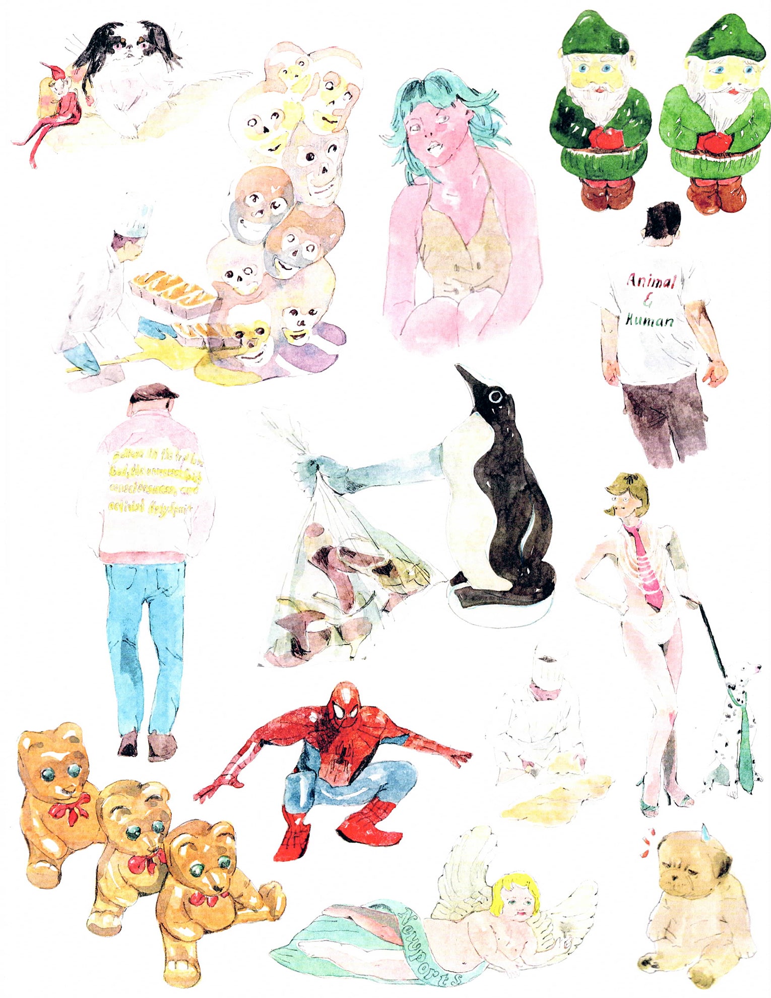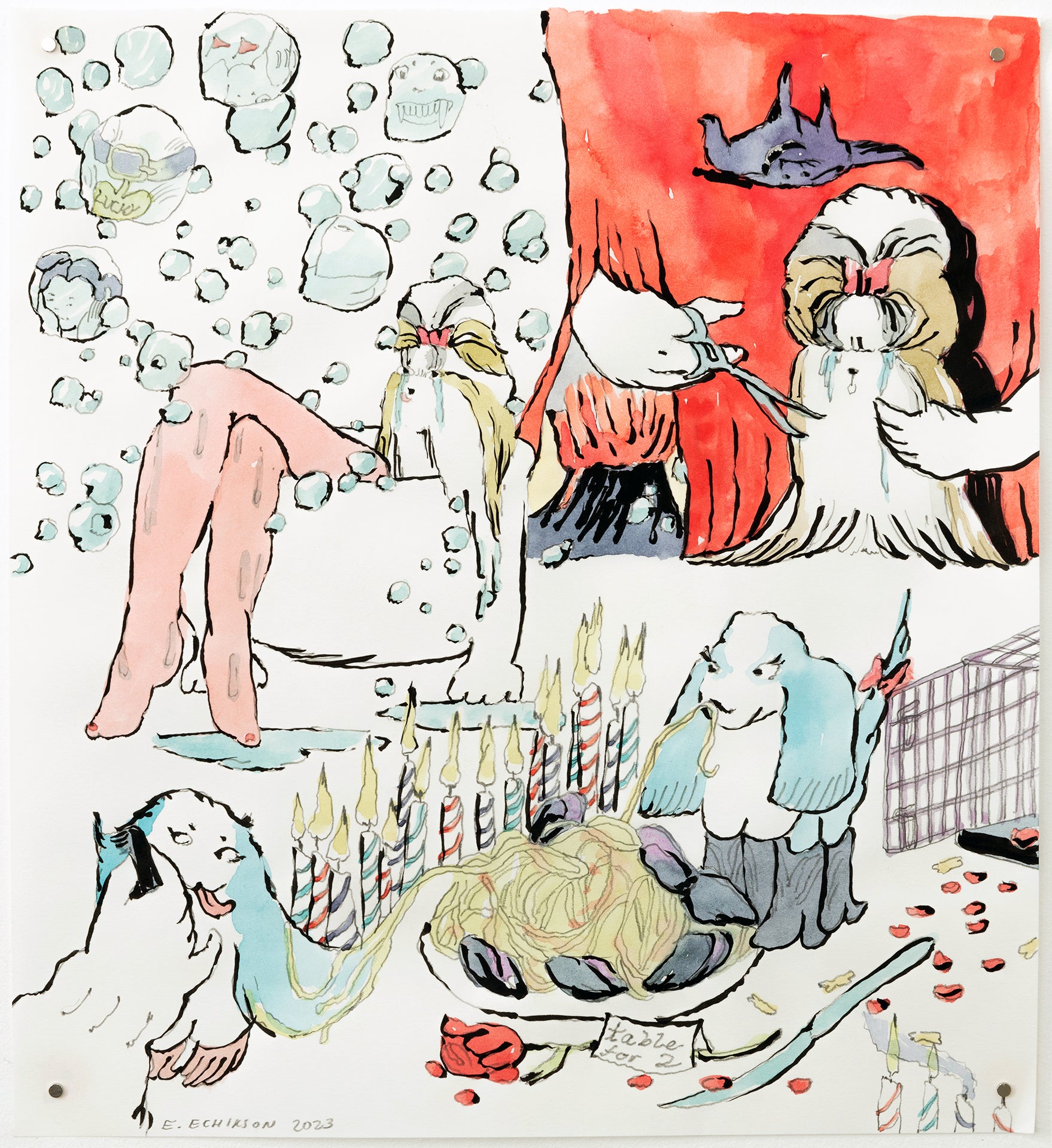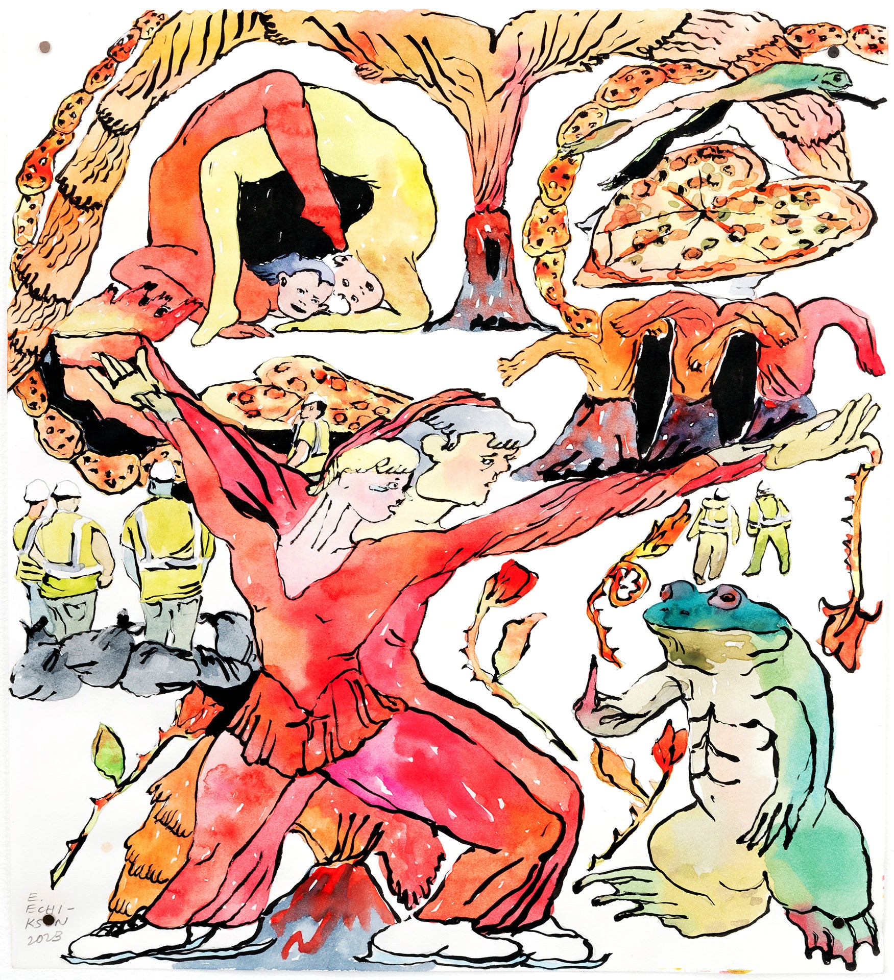 Echikson’s illustrations are featured in Being Work, a forthcoming book from Insert Press, edited by Dorothy Dubrule. A collection of essays by dance and theater artists that describe the labor of performance within visual arts contexts, Being Work captures a spectrum of profound and mundane moments while asking how this kind of gig work is perceived and valued. Echikson’s eight illustrations for the book can be viewed alongside additional works by the artist in the exhibition Here Sometimes at General Projects. The closing party for Echikson’s show in early-February 2024 will also be the launch party for Being Work (exact date and details TBD).