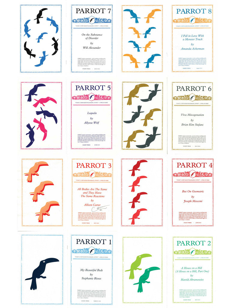 PARROT will print the work of Harold Abramowitz’s A House on a Hill (A House on a Hill, Part One), Amanda Ackerman’s I Fell in Love with a Monster Truck, Will Alexander’s On the Substance of Disorder, Stan Apps’Politicized Pretty Picture, Amina Cain’s Tramps Everywhere, Teresa Carmody’s I Can Feel, Allison Carter’s All Bodies Are The Same and They Have The Same Reactions, Michelle Detorie’s Fur Birds, Kate Durbin’s Kept Women, K. Lorraine Graham’s My Little Neoliberal Pony, Jen Hofer’s The Missing Link, Maximus Kim’s Break Bloom Burn, Janice Lee’s Fried Chicken Dinner, Bruna Mori and George Porcari’s May I take Your Order?, Joseph Mosconi’s But On Geometric, Vanessa Place’s Forcible Oral Copulation, Amarnath Ravva’s Airline Music, Stephanie Rioux’s My Beautiful Beds, Ara Shirinyan’s Erotic in Czech Republic, Michael Smoler’s Pieces of Water, Brian Kim Stefans’ Viva Miscegenation, Mathew Timmons’ Complex Textual Legitimacy Proclamation, and Allyssa Wolf’s Loquela.